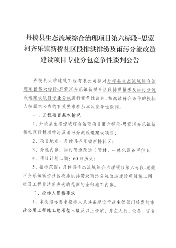 【大雅建筑公司】丹棱縣生態(tài)流域綜合治理項目第六標段-思蒙河齊樂鎮(zhèn)新橋社區(qū)段排洪排澇及雨污分流改造建設項目專業(yè)分包競爭性談判公告