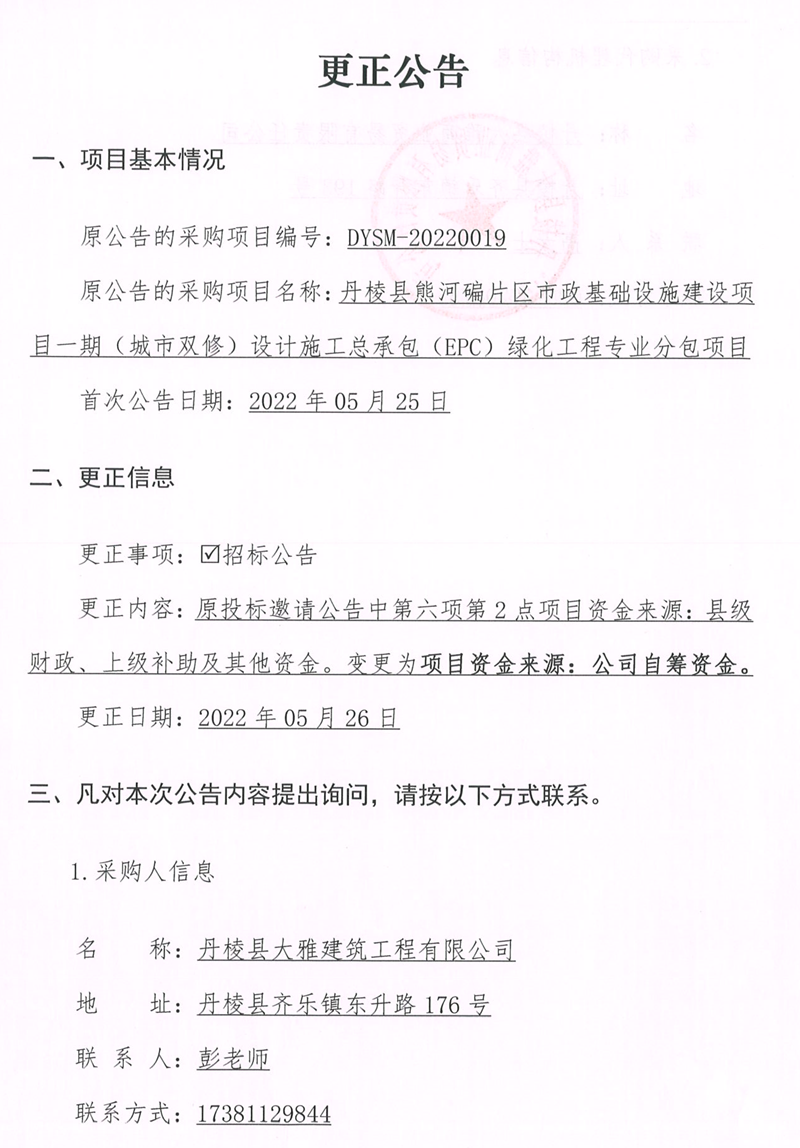 丹棱縣熊河碥片區(qū)市政基礎(chǔ)設(shè)施建設(shè)項(xiàng)目一期(城市雙修)設(shè)計(jì)施工總承包(EPC)綠化工程專(zhuān)業(yè)分包項(xiàng)目更正公告
