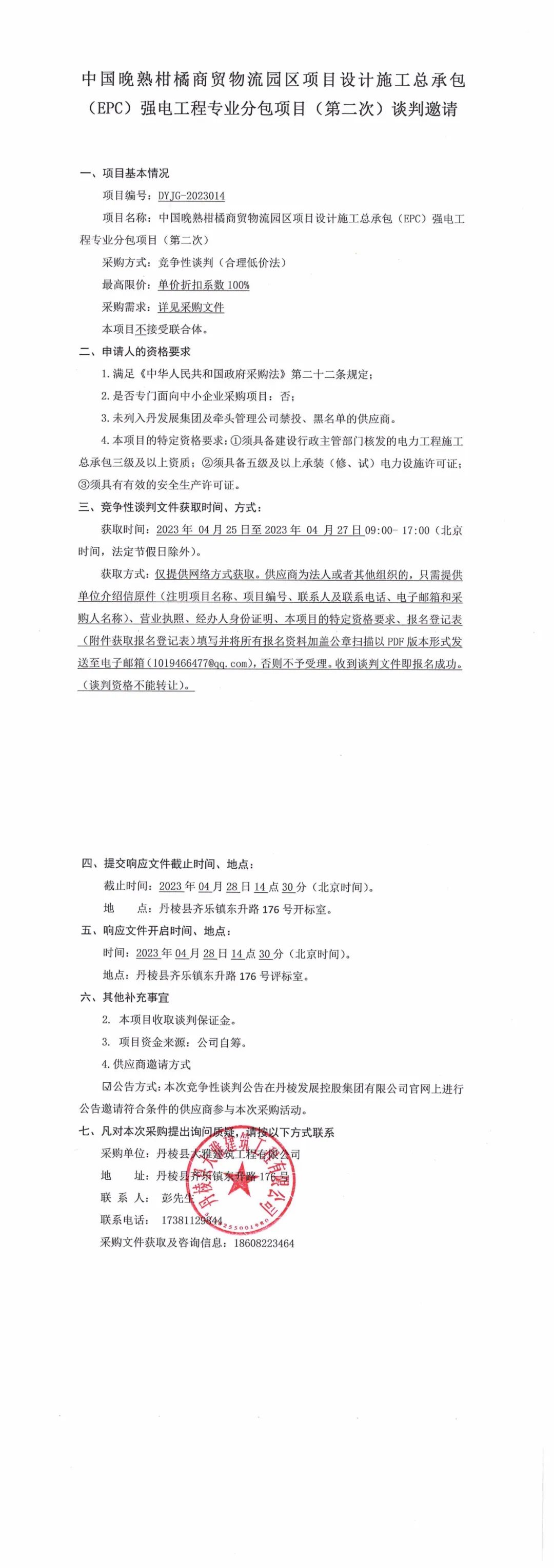 中國(guó)晚熟柑橘商貿(mào)物流園區(qū)項(xiàng)目設(shè)計(jì)施工總承包(EPC)強(qiáng)電工程專(zhuān)業(yè)分包項(xiàng)目(第二次)競(jìng)爭(zhēng)性談判邀請(qǐng)