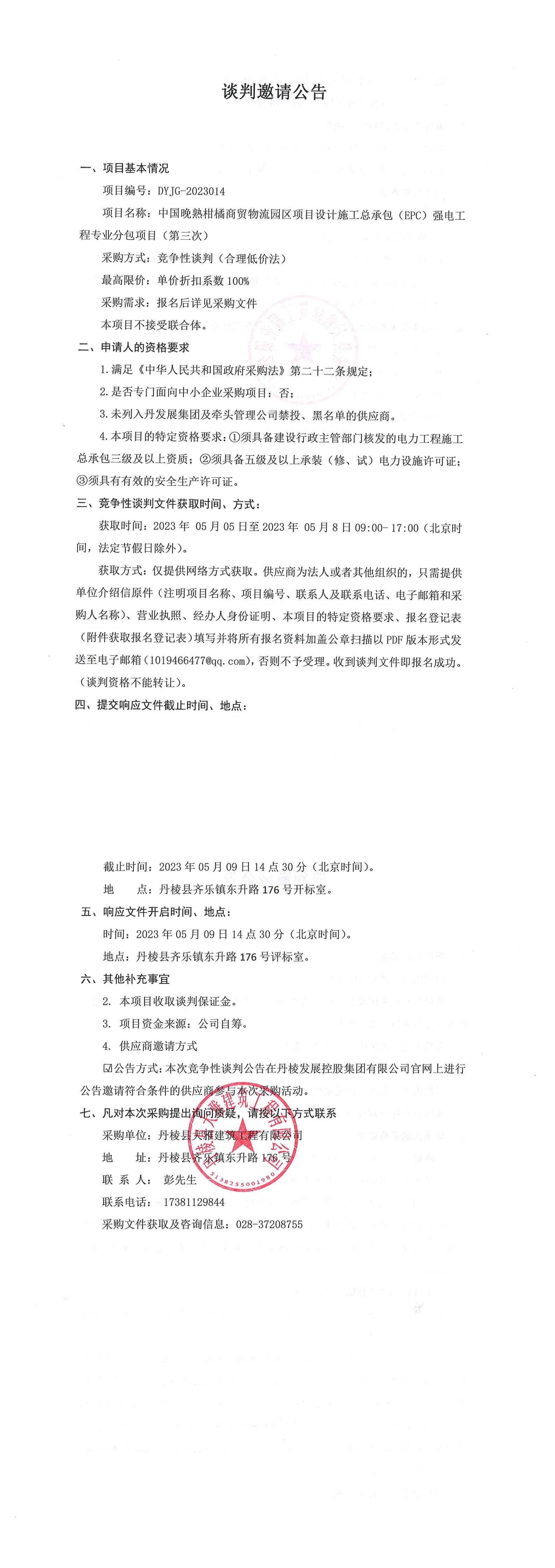 中國晚熟柑橘商貿(mào)物流園區(qū)項(xiàng)目設(shè)計(jì)施工總承包(EPC)強(qiáng)電工程專業(yè)分包項(xiàng)目(第三次)談判邀請公告