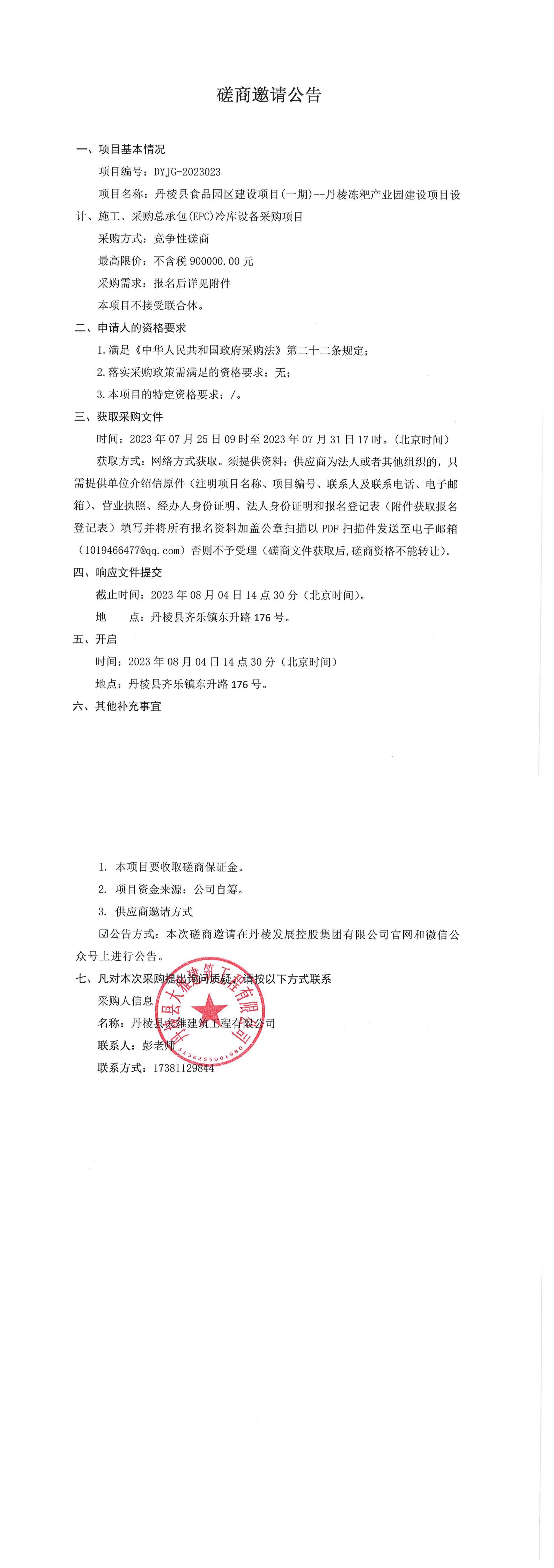 丹棱縣食品園區(qū)建設(shè)項(xiàng)目(一期)--丹棱凍粑產(chǎn)業(yè)園建設(shè)項(xiàng)目設(shè)計(jì)、施工、采購(gòu)總承包(EPC)冷庫設(shè)備采購(gòu)項(xiàng)目磋商邀請(qǐng)公告