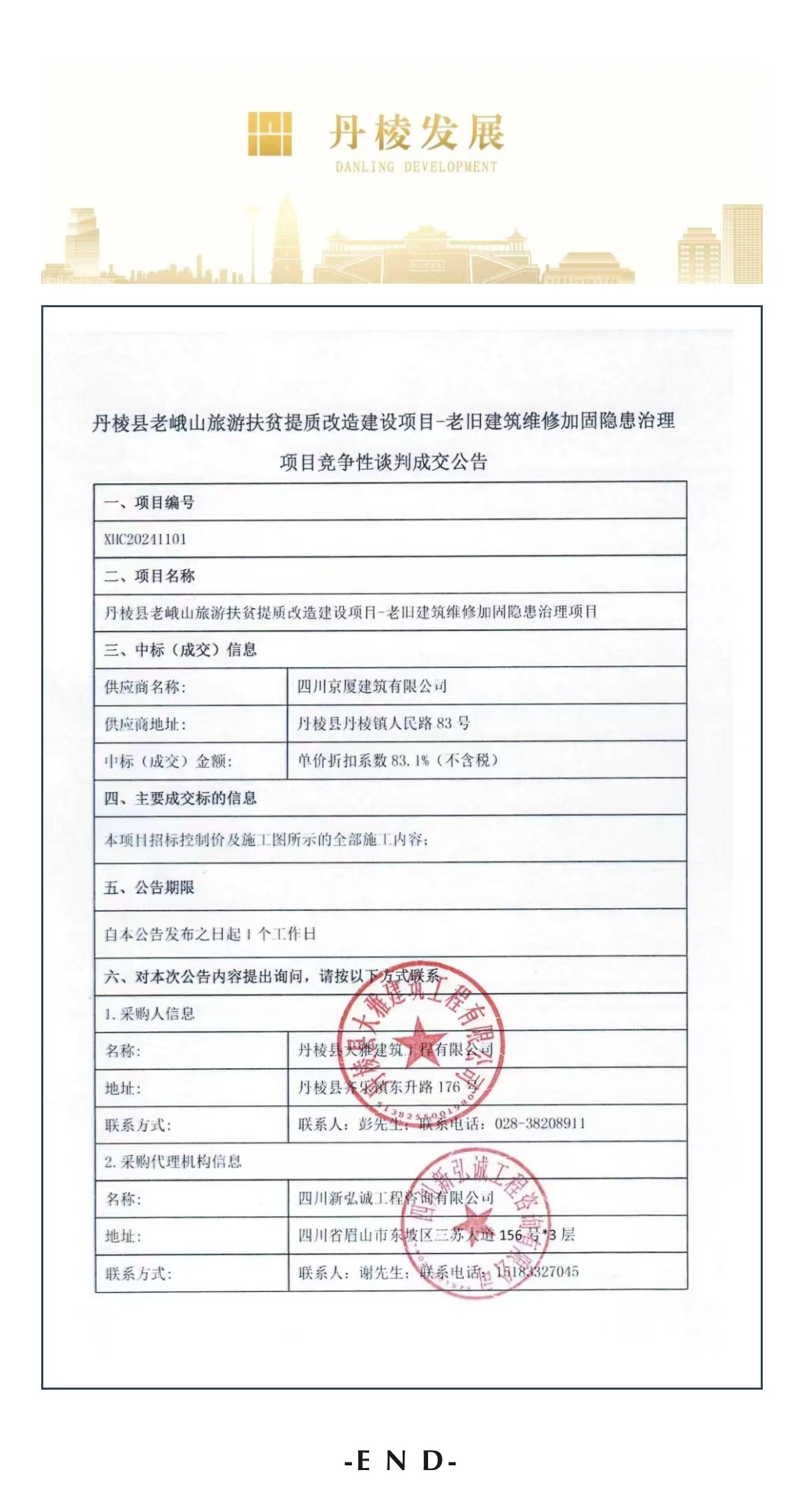 丹棱縣老峨山旅游扶貧提質改造建設項目——老舊建筑維修加固隱患治理項目競爭性談判成交公告