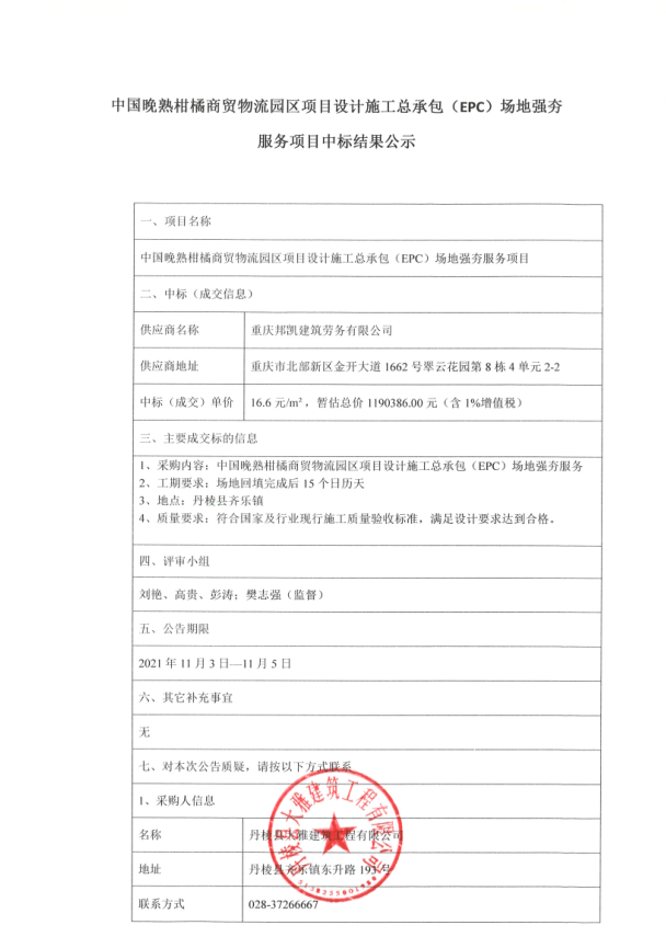 【大雅建筑公司】中國晚熟柑橘商貿(mào)物流園區(qū)項(xiàng)目設(shè)計(jì)施工總承包(EPC)場(chǎng)地強(qiáng)夯服務(wù)項(xiàng)目中標(biāo)結(jié)果公示