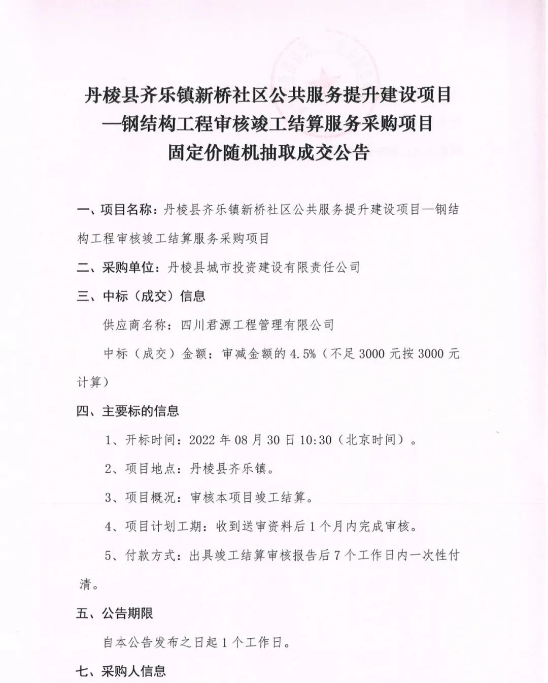 丹棱縣齊樂鎮(zhèn)新橋社區(qū)公共服務(wù)提升建設(shè)項(xiàng)目--鋼結(jié)構(gòu)工程審核竣工結(jié)算服務(wù)采購項(xiàng)目固定價(jià)隨機(jī)抽取成交公告