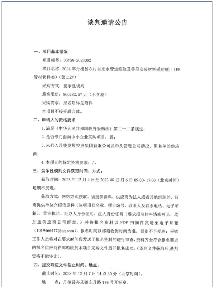 2024年丹棱縣農(nóng)村自來水管道維修及零星安裝材料采購項(xiàng)目(PE管材管件類)(第二次)談判邀請(qǐng)公告