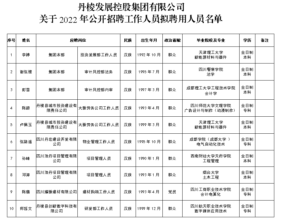 附件:丹棱發(fā)展控股集團有限公司關于2022年公開招聘工作人員擬聘用人員名單