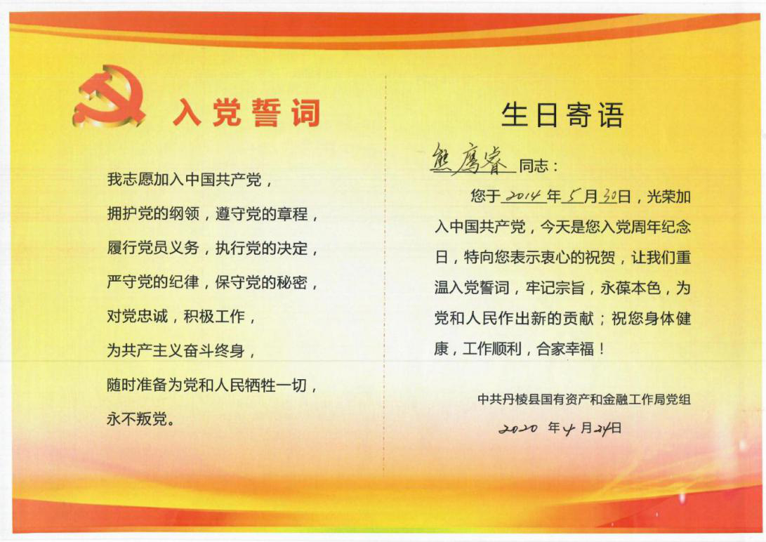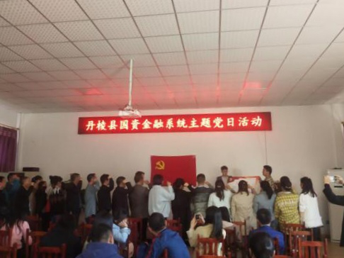 工作安排后,縣國資金融局黨組集體為5月入黨黨員過政治生日,縣國資金融局(縣金融服務(wù)中心)副主任茍永慶同志為“過生日”的黨員們送上精心制作的“黨員政治生日卡”,勉勵黨員同志要“常思入黨初衷、銘記入黨誓詞、牢記黨員義務(wù)”,發(fā)揮黨員先鋒模范作用,在今后的工作中不斷創(chuàng)先爭優(yōu),做好表率。活動最后,全體黨員同志在縣國資金融局黨組成員、副局長潘國榮同志的帶領(lǐng)下重溫入黨誓詞、面對黨旗莊嚴宣誓。